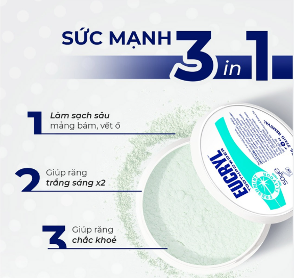 + Sản phẩm có dạng bột mịn dễ dàng len lỏi sâu vào các kẽ răng để làm sạch tối ưu, đánh bay các mảng bám cứng đầu, khắc phục tình trạng răng ố vàng do thuốc lá, trà, cà phê hay thậm chí là vết bám của rượu vang đỏ… để lại cho bạn một hàm răng sạch sẽ, sáng trắng cùng với hương vị sảng khoái tươi mát của bạc hà.