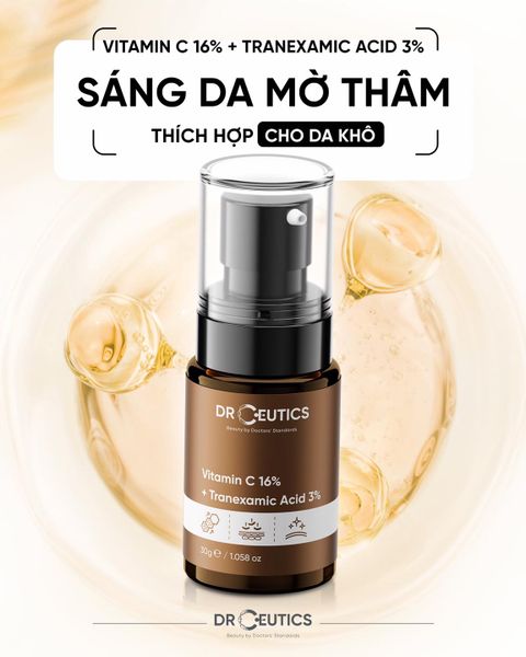 + Các sản phầm khác của nhà DrCeutics thích hợp để sử dụng trước “Vitamin C 16% + Tranexamic Acid 3%”: Aqualic BHA 2% Herbal Toner, BHA 2% + Zinc 1% → tăng cường khả năng làm sáng da, mờ vết thâm.