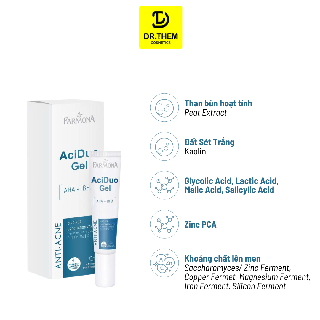 - Tên sản phẩm: Gel Chấm Mụn Farmona AciDuo AHA + BHA + ZinC Giảm Mụn Trứng Cá Hiệu Quả 15ml