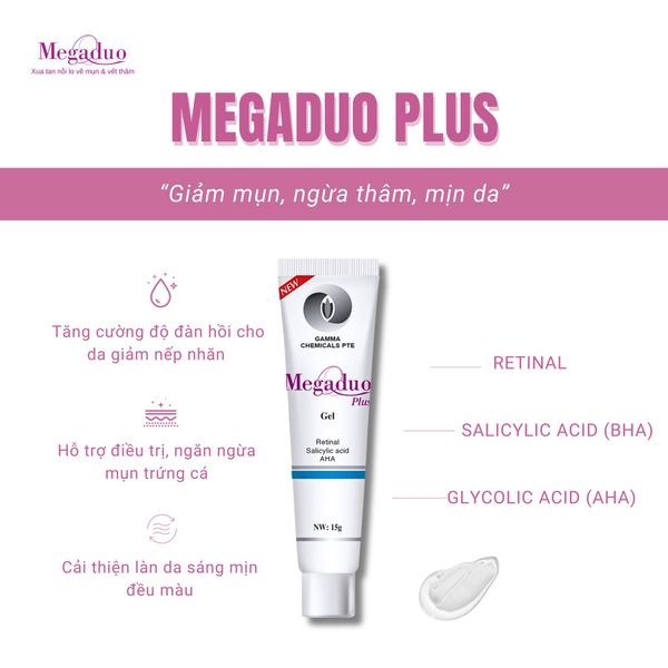 - Tên sản phẩm: Gel Dưỡng Megaduo Plus Gel (Retinal + Salicylic Acid + AHA) Giảm Mụn, Mờ Thâm 15g - Bản Plus
