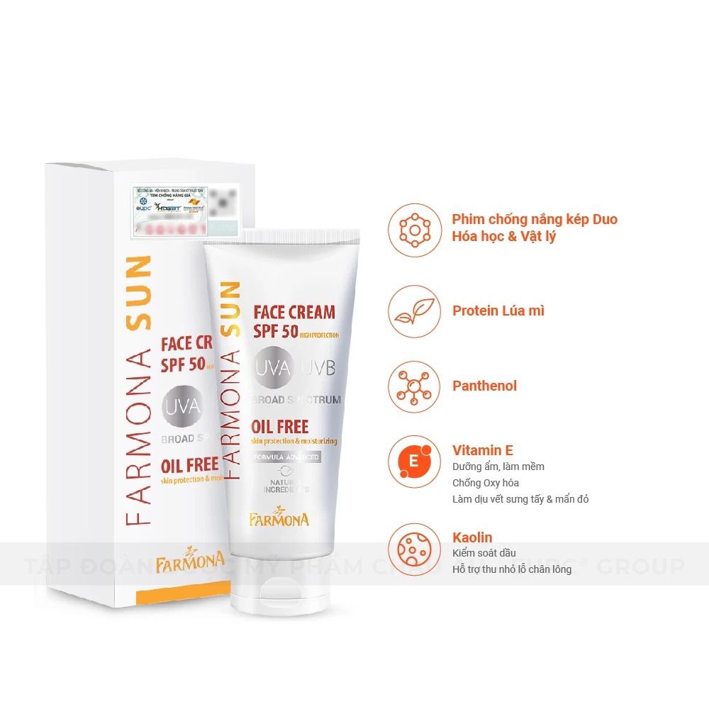 - Tên sản phẩm: Kem Chống Nắng Farmona Sun Face Cream Oil Free SPF50+ Không Chứa Dầu Dành Cho Da Dầu Mụn 50ml