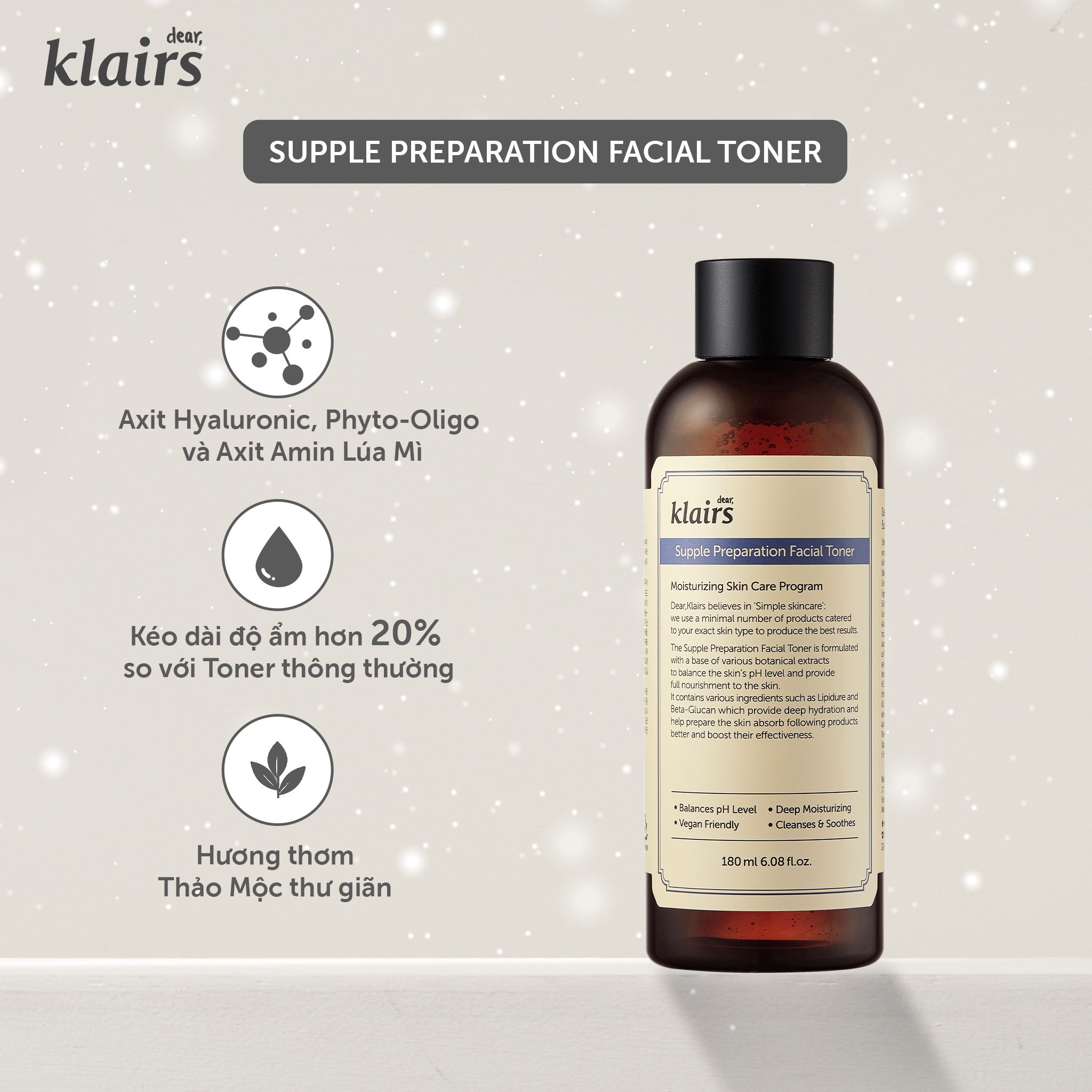 + Klairs Supple Preparation Facial Toner giúp kéo dài độ ẩm hơn 20% so với các loại Toner thông thường với Sodium Hyaluronate và Beta-glucan.