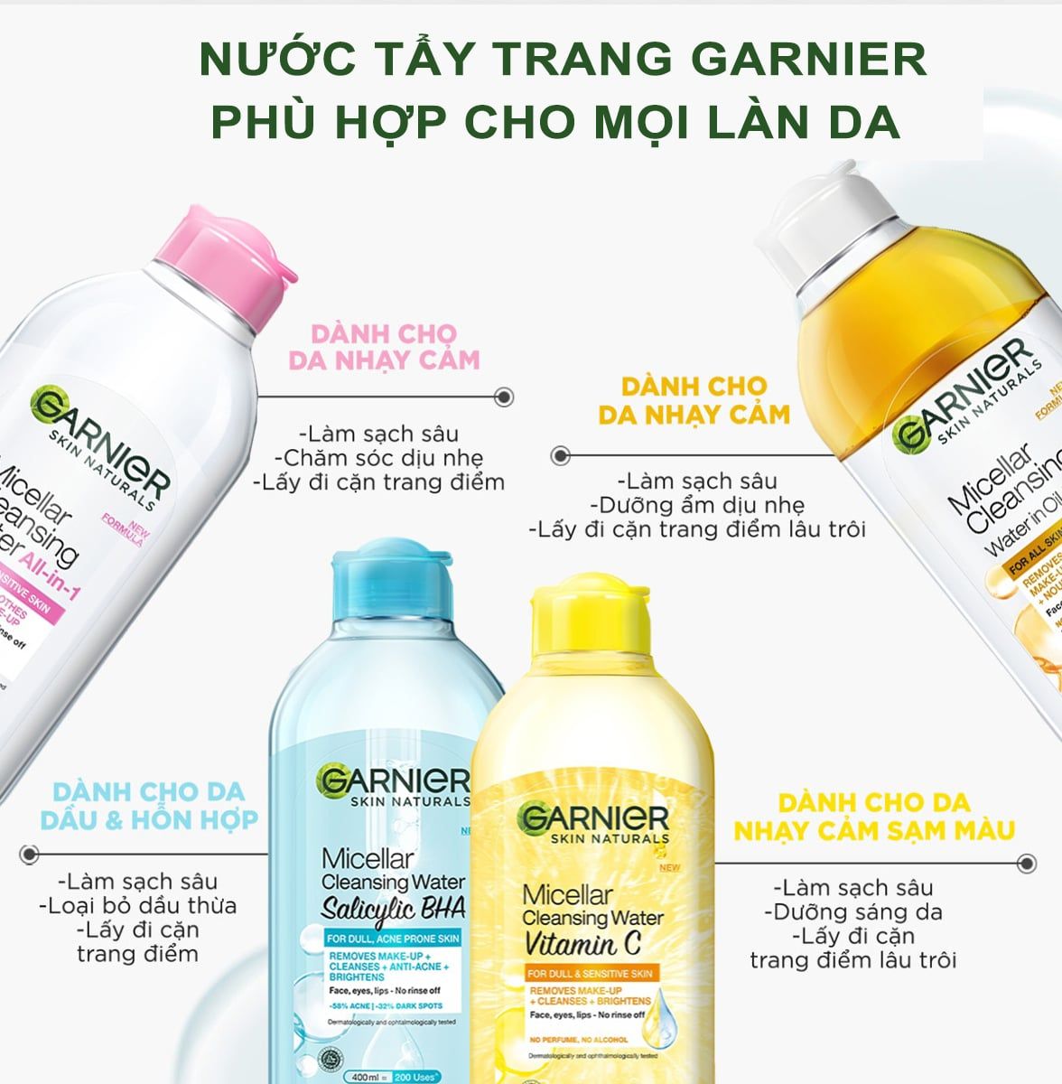 + Lần đầu tiên, thương hiệu Garnier cho ra đời dòng sản phẩm nước tẩy trang mới với sự kết hợp giữa công nghệ Micelles (Micellar Technology) và thành phần làm sáng da Vitamin C - Garnier Vitamin C Micellar Water giúp loại bỏ lớp trang điểm và làm sạch da chỉ trong 1 lần sử dụng, mang lại làn da tươi sáng và rạng rỡ hơn tức thì.