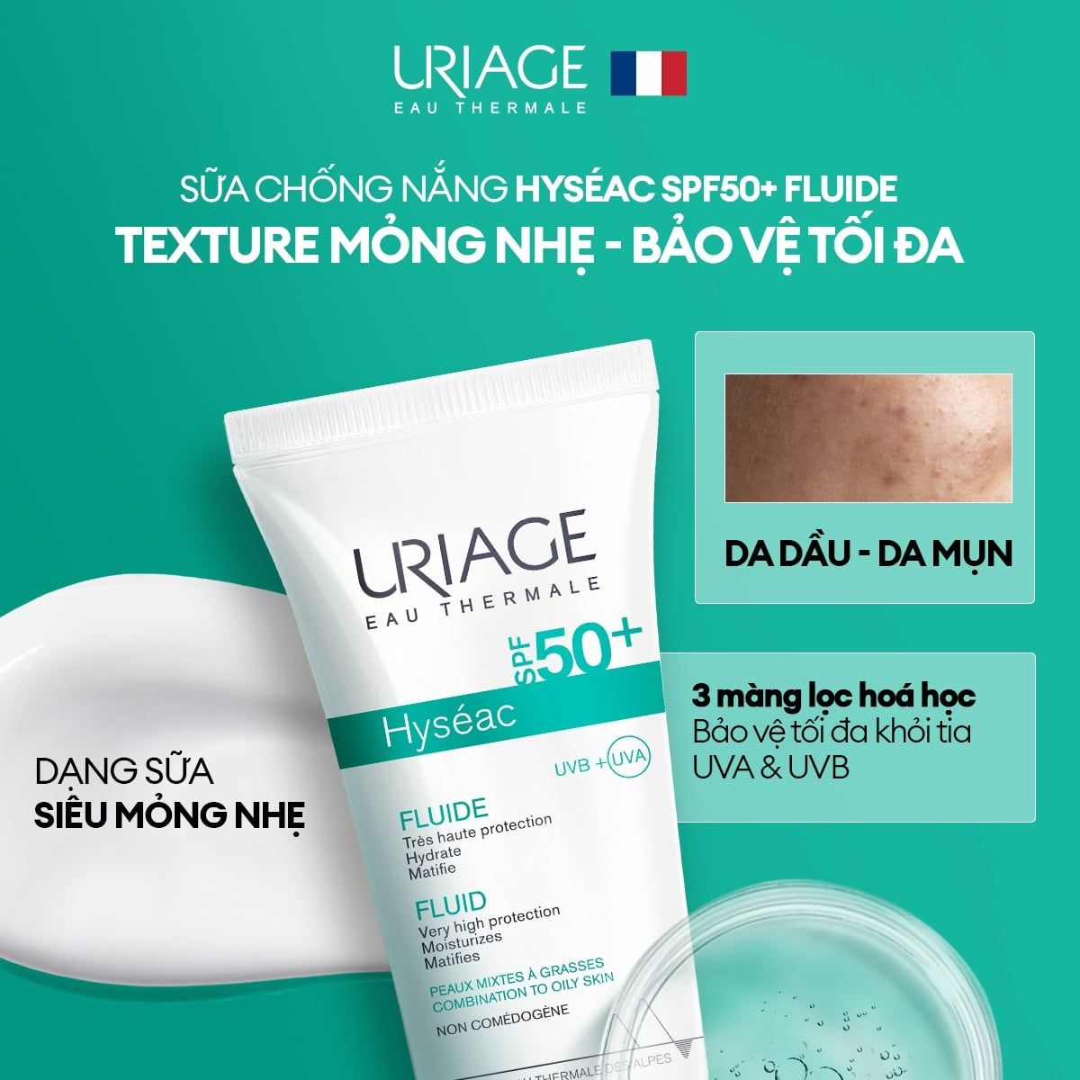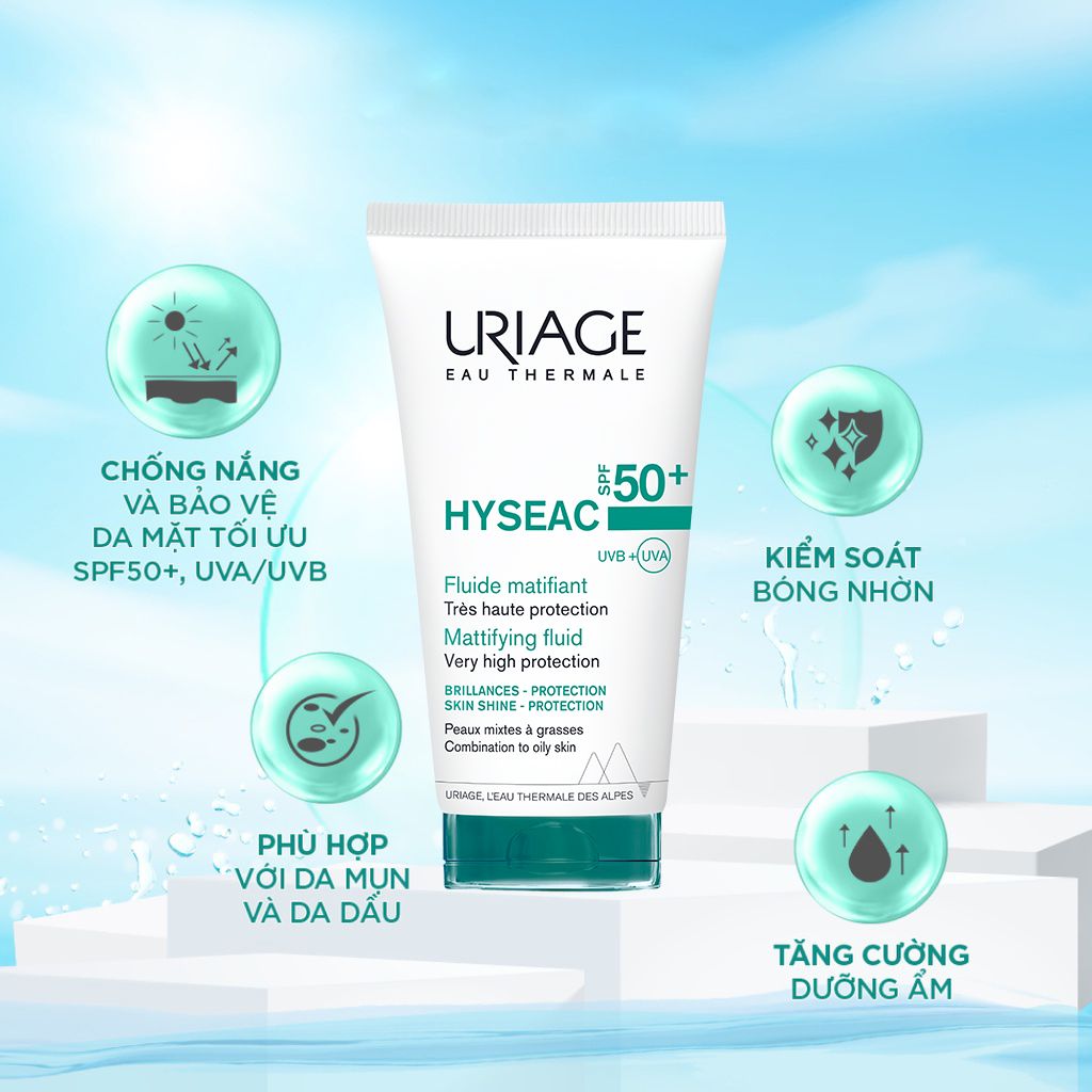 - Tên sản phẩm: Sữa Chống Nắng Uriage Hyseac Fluide SPF50+ Kiềm Dầu Cho Da Dầu Mụn, Hỗn Hợp