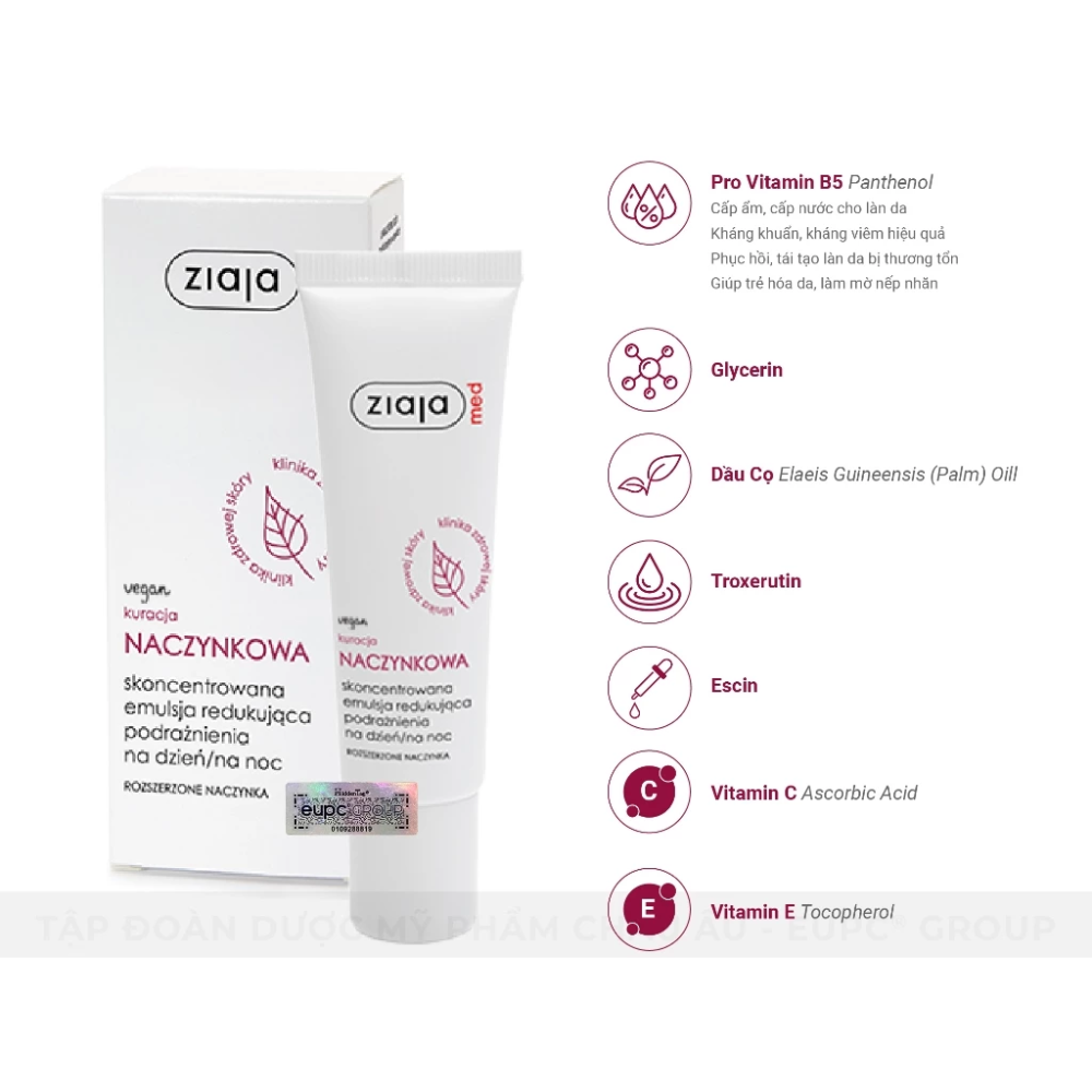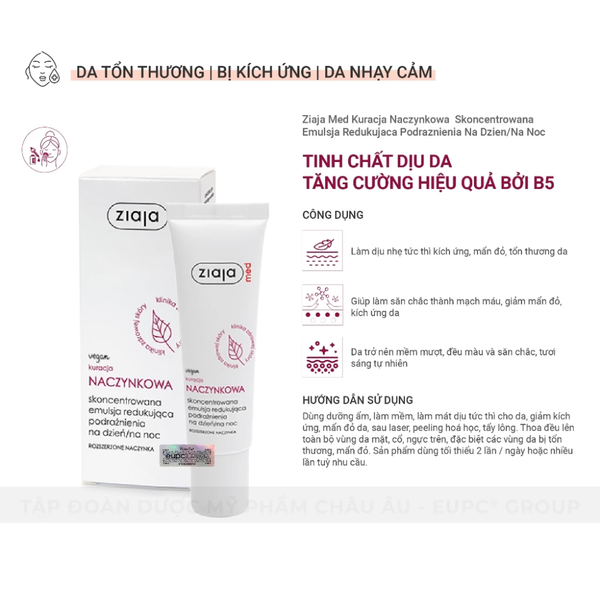 + Panthenol (Vitamin B5) và các hoạt chất thảo dược trong Ziaja Med Kuracja Naczynkowa có tác dụng làm dịu và giảm viêm hiệu quả.